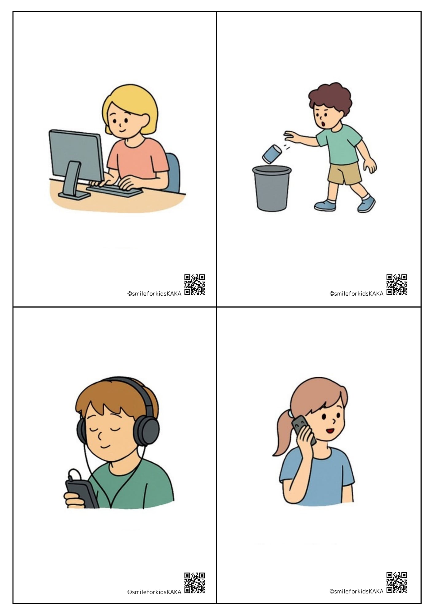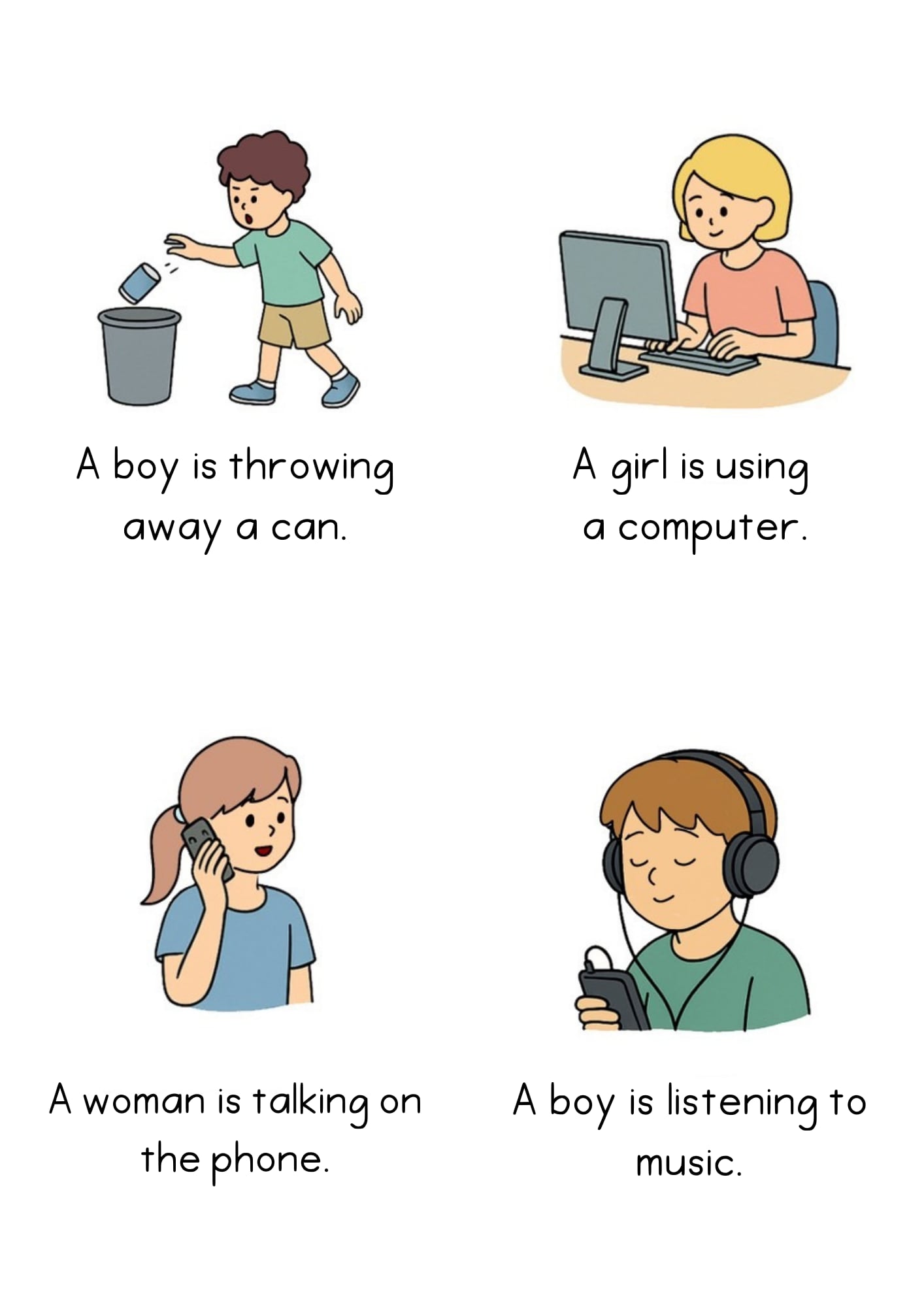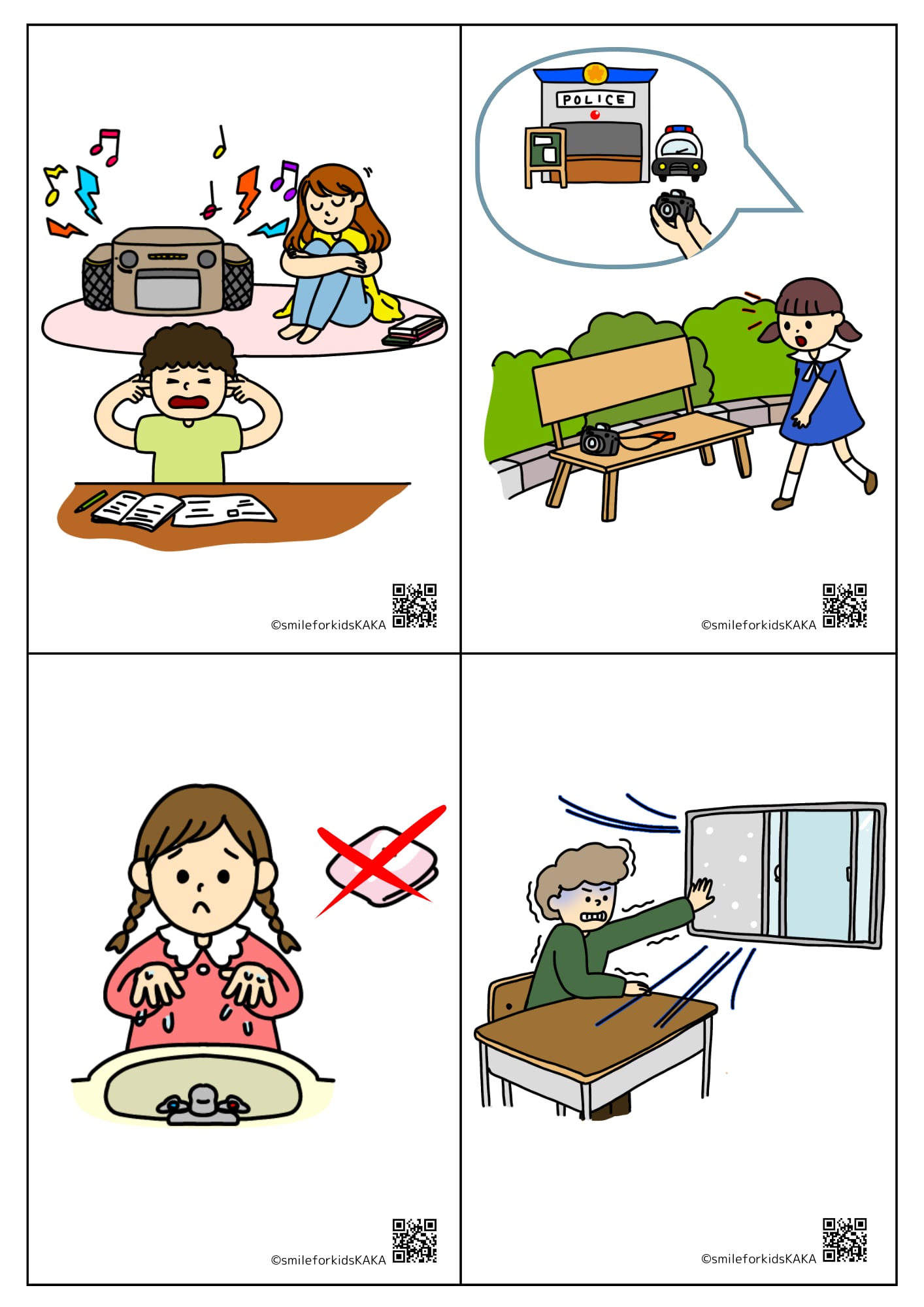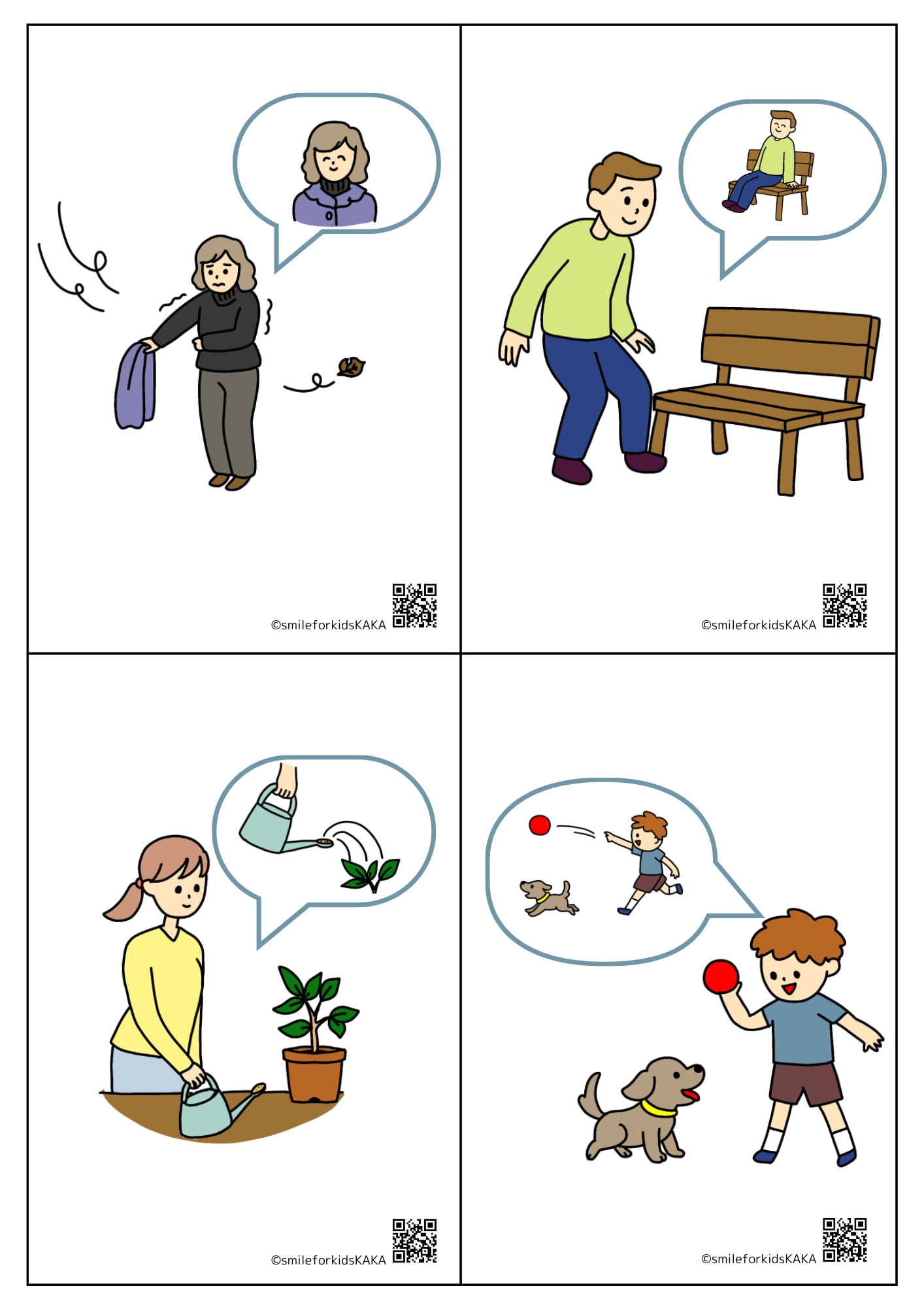 人物・場所・行動など、イラスト全体を見て説明する練習用カード。