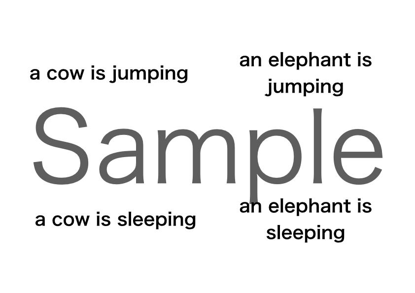 10匹の動物とsleeping,jumping,dancing,skating,eating,drinking の使い方を学べます。