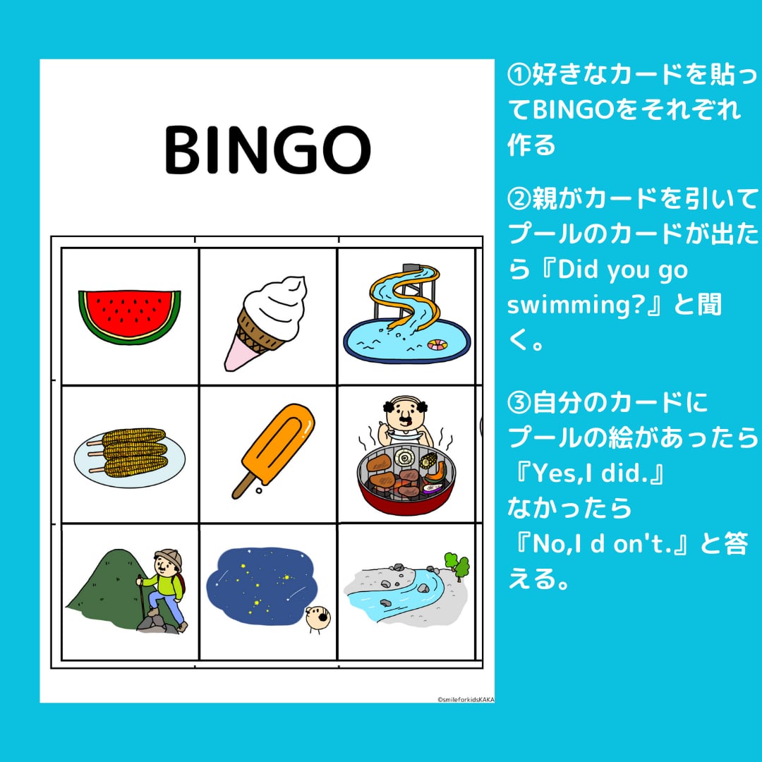 夏に経験しそうな事柄の英語表現を現在形と過去形で覚えられるようになっています。