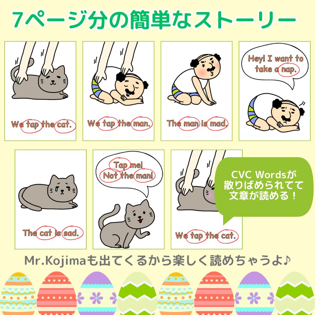 CVC words を使った簡単な文章のストーリーが5つ入っています!
